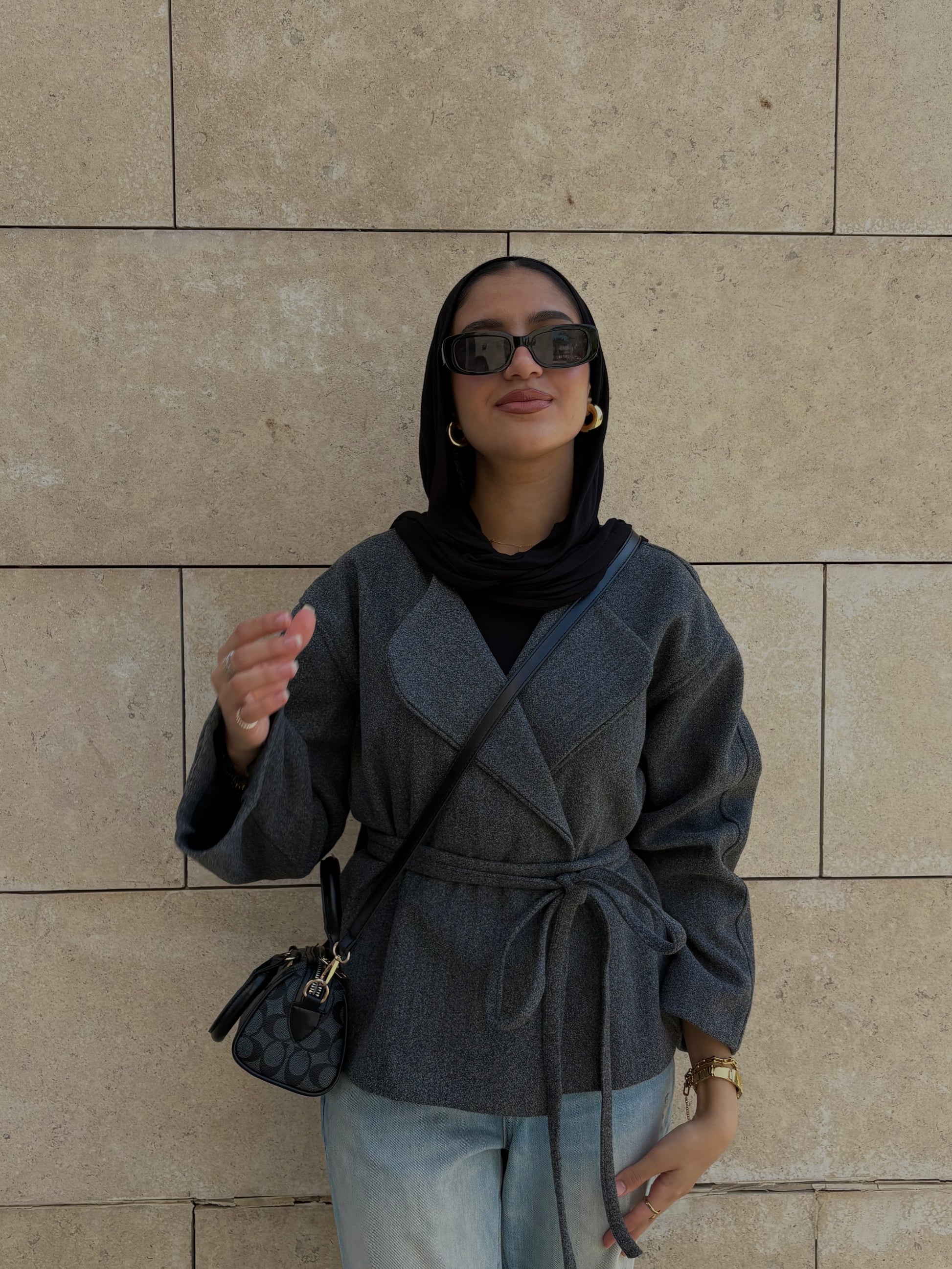 This piece features a soft wool fabric with a cozy, elegant feel — perfect for layering on breezy days. It comes with a waist belt that ties beautifully, adding a flattering shape to every body.