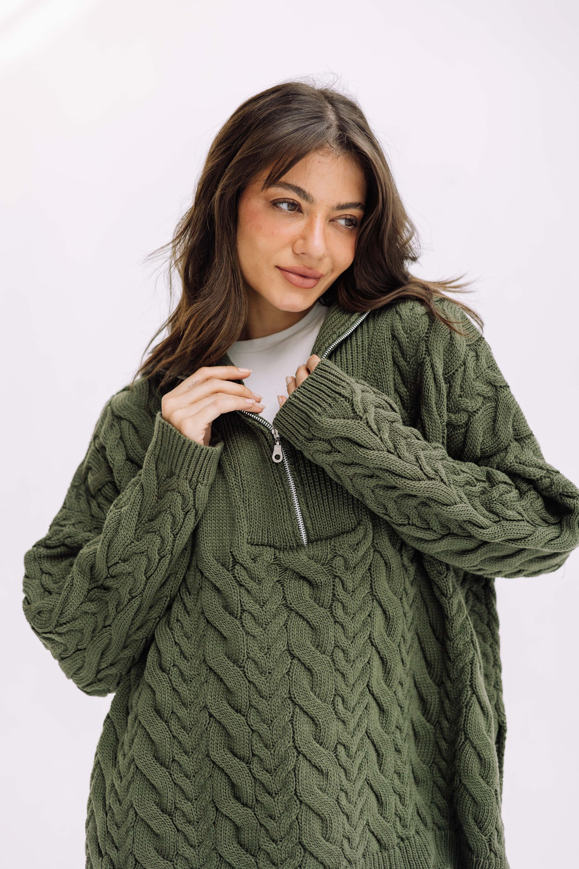 A cozy, cable-knit essential designed for effortless winter layering. Features a soft braided texture, a relaxed zip-up collar, and an oversized fit that keeps you warm without feeling heavy. Perfect for everyday wear — from casual mornings to chilly nights.