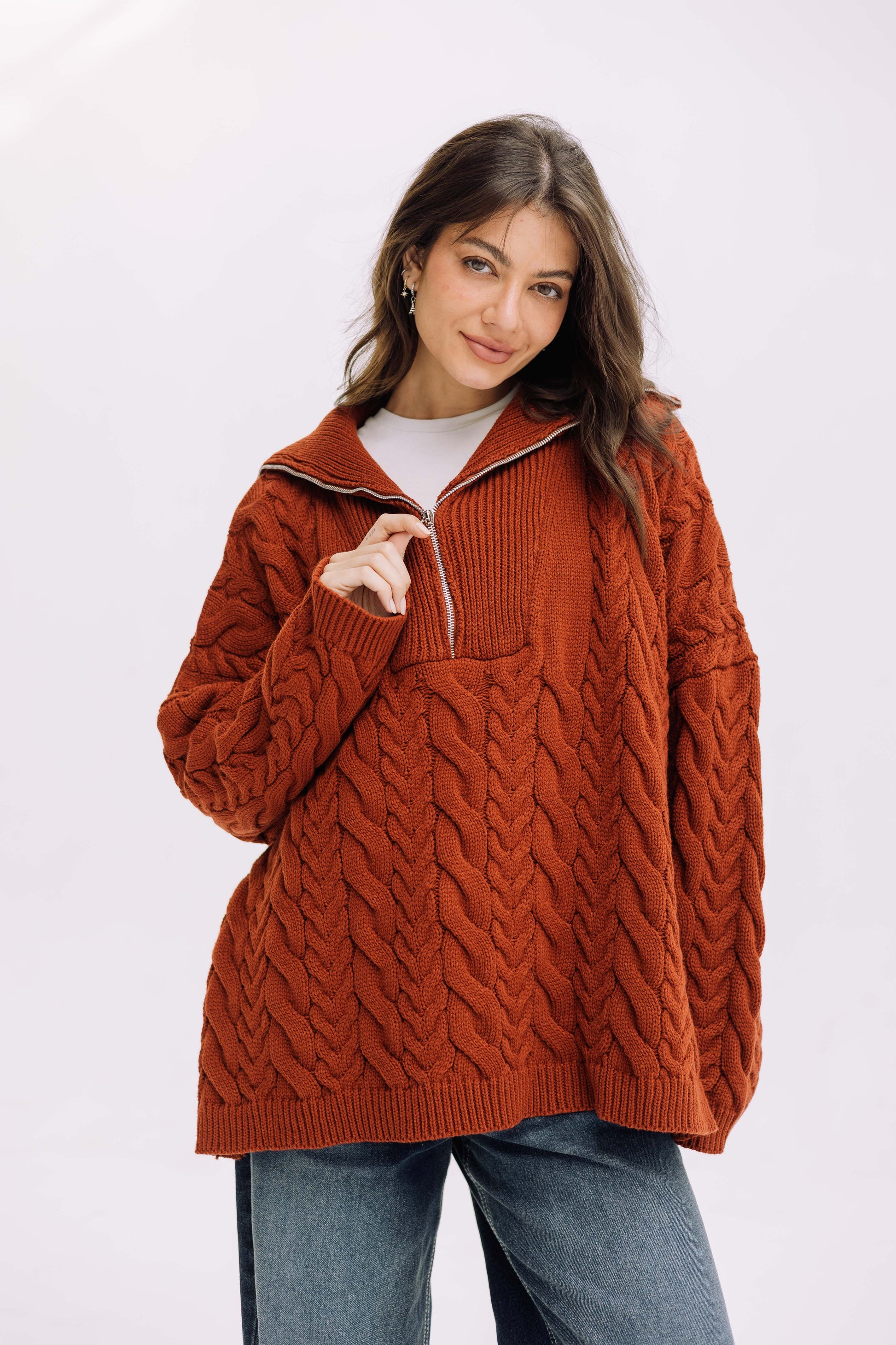A cozy, cable-knit essential designed for effortless winter layering. Features a soft braided texture, a relaxed zip-up collar, and an oversized fit that keeps you warm without feeling heavy. Perfect for everyday wear — from casual mornings to chilly nights.