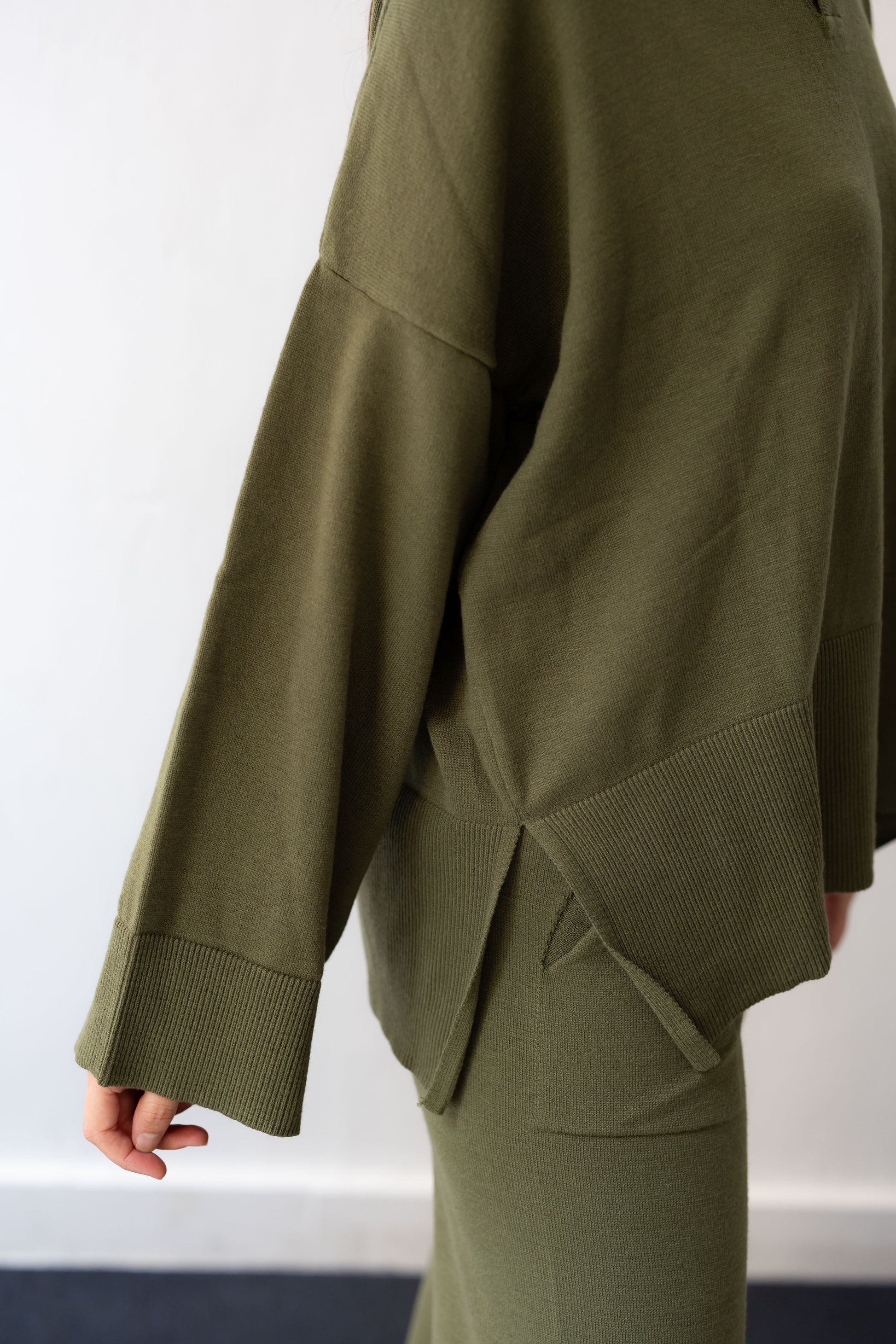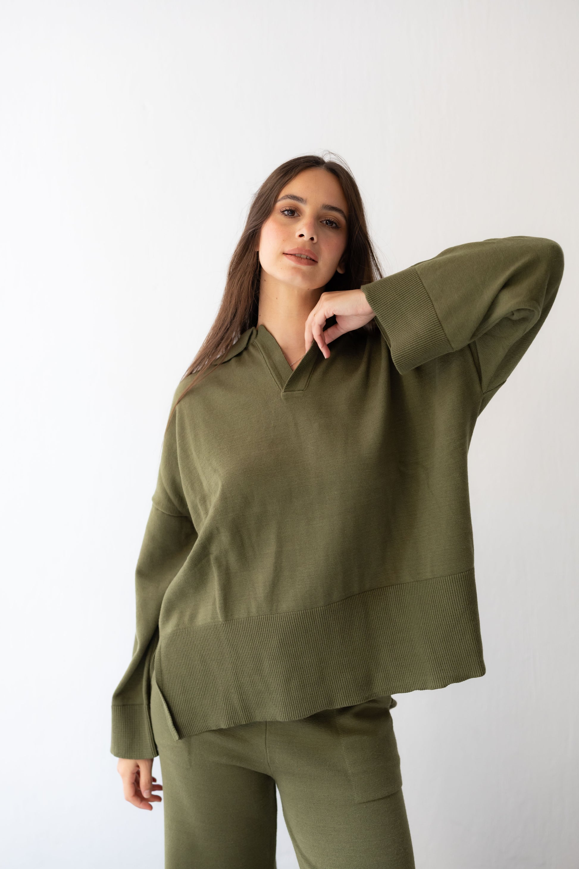This relaxed knit set is designed for everyday comfort — featuring an oversized top with side slits and wide-leg pants for an effortlessly cozy look.