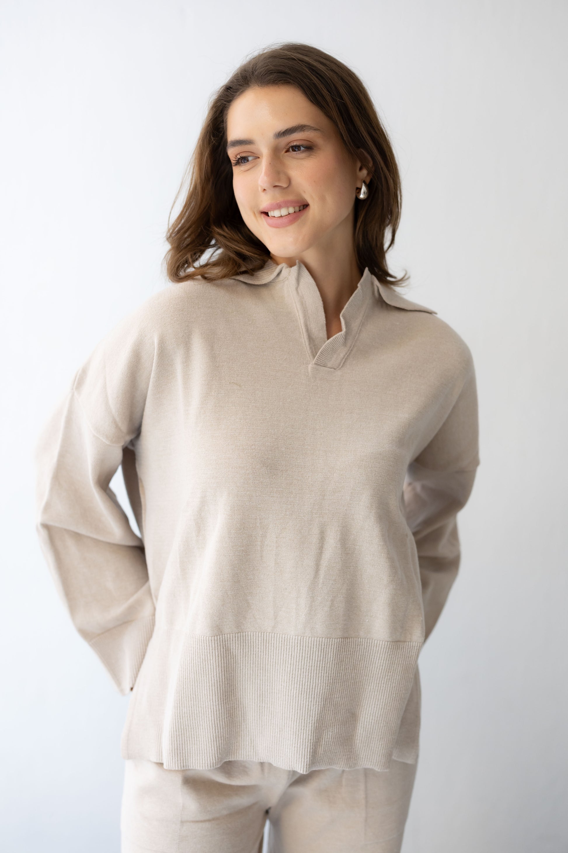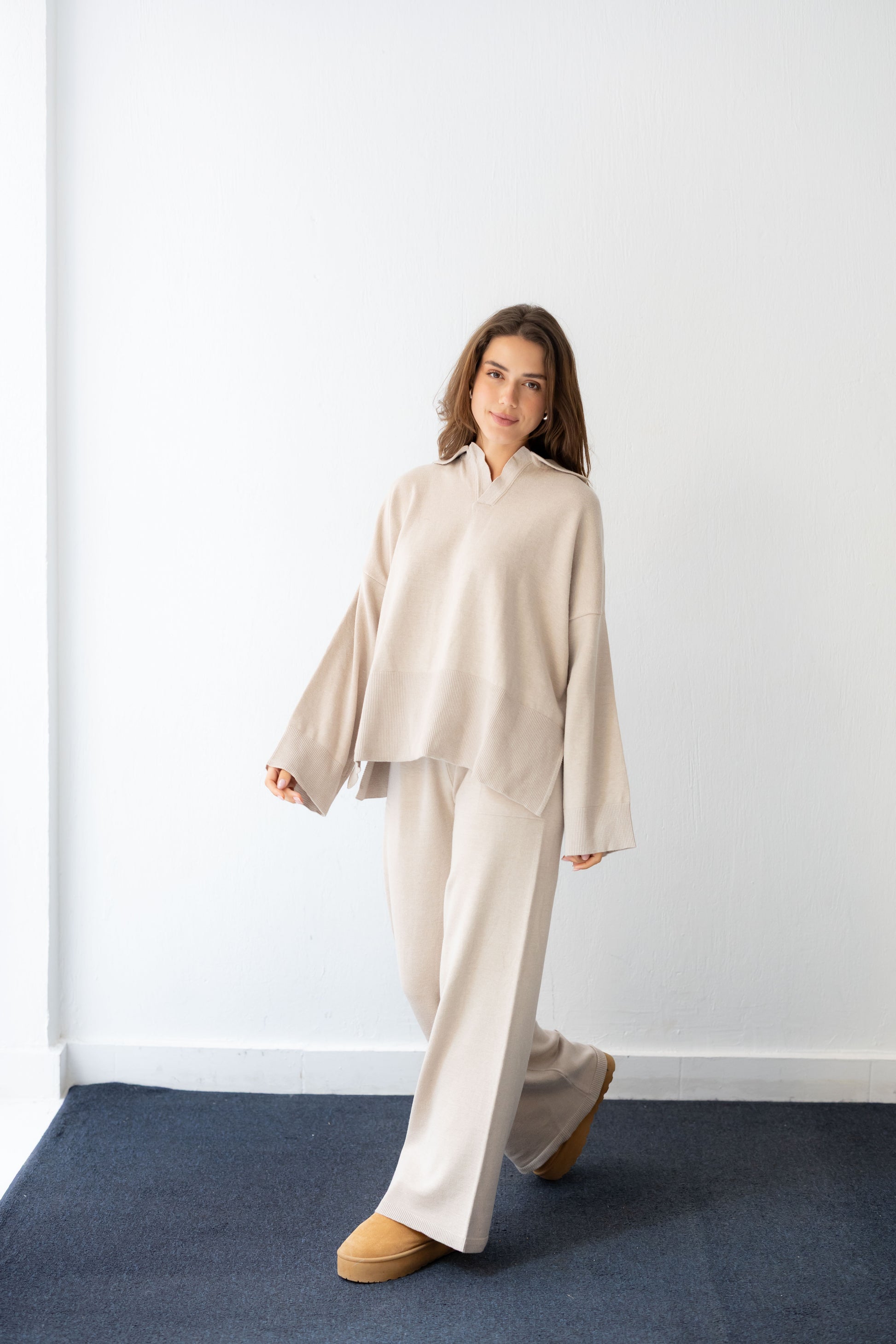 This relaxed knit set is designed for everyday comfort — featuring an oversized top with side slits and wide-leg pants for an effortlessly cozy look.