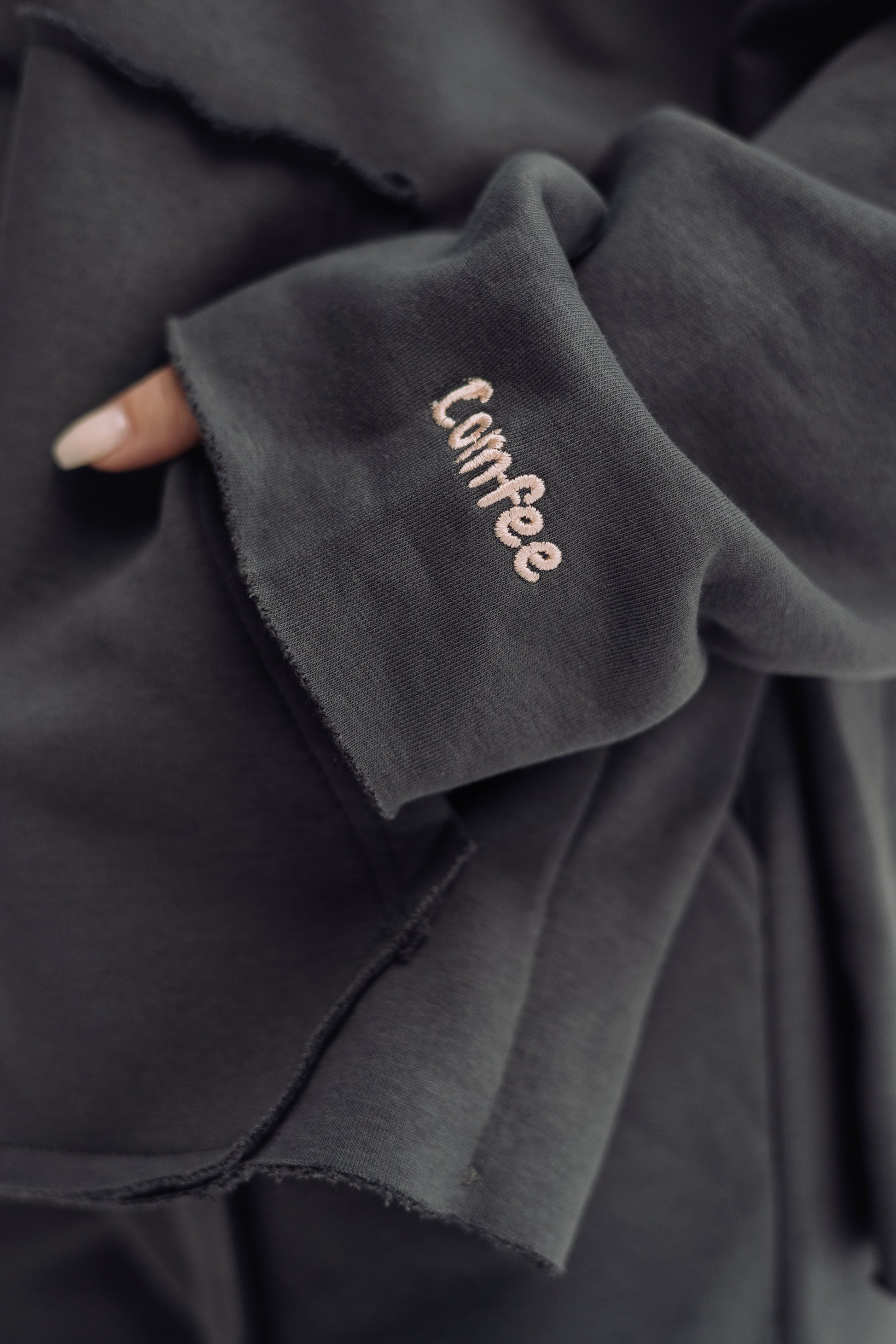 What makes it truly special is that the word “Comfee” is embroidered directly on the set, taken from the set’s own name and used as a signature design detail. This embroidery reflects the cozy identity of the set and completes its effortless look.