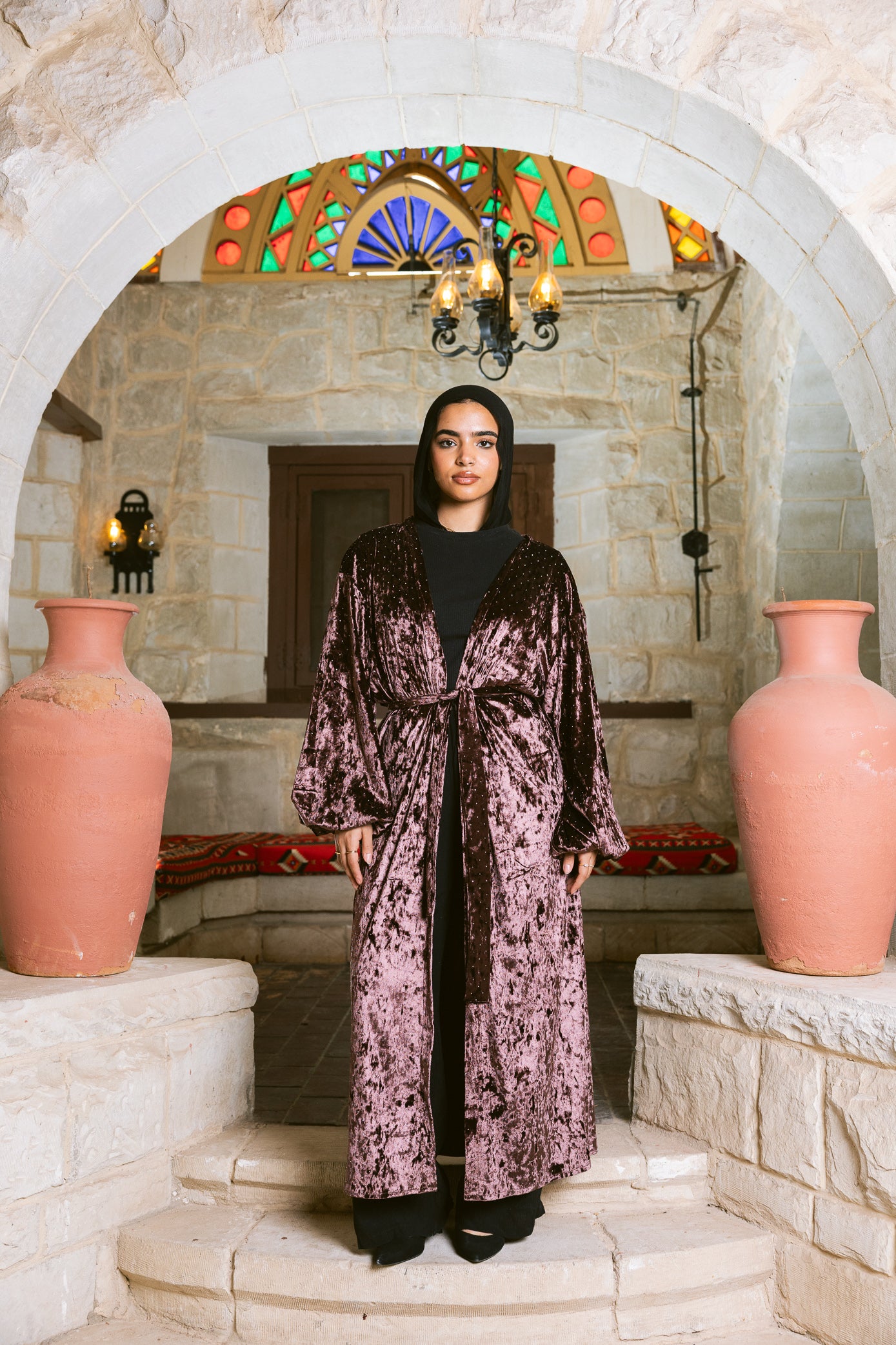 A statement piece inspired by moonlit nights. The Moonfall Kaftan is crafted from luxurious crushed velvet with a subtle shimmer that catches the light beautifully. Designed with a relaxed silhouette and soft draped sleeves for effortless elegance.