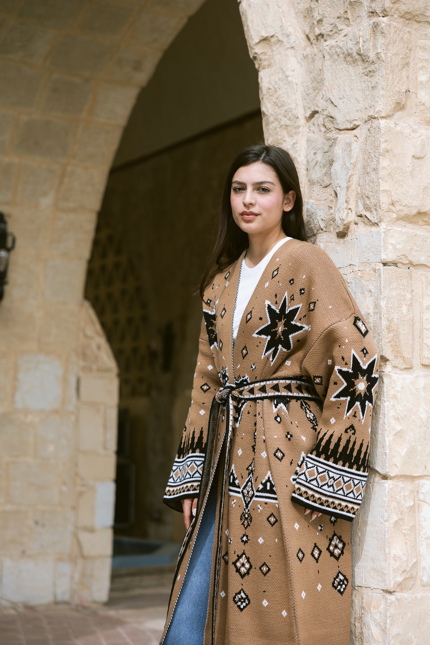 Inspired by the quiet beauty of desert nights, the Nojom Kaftan blends heritage patterns with a modern silhouette. Designed in a rich knitted fabric with statement star motifs, it brings warmth, structure, and effortless elegance to your everyday layering.