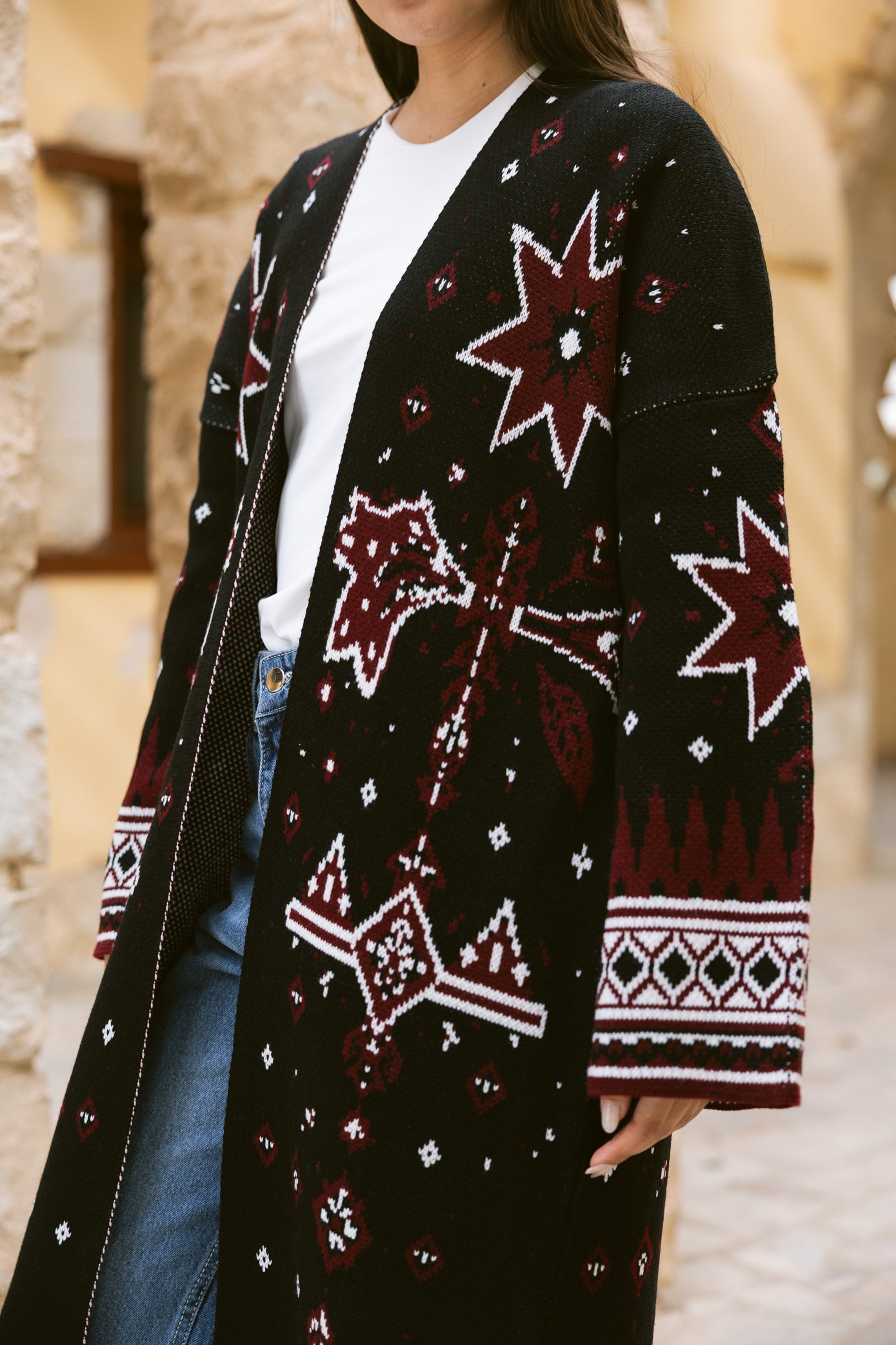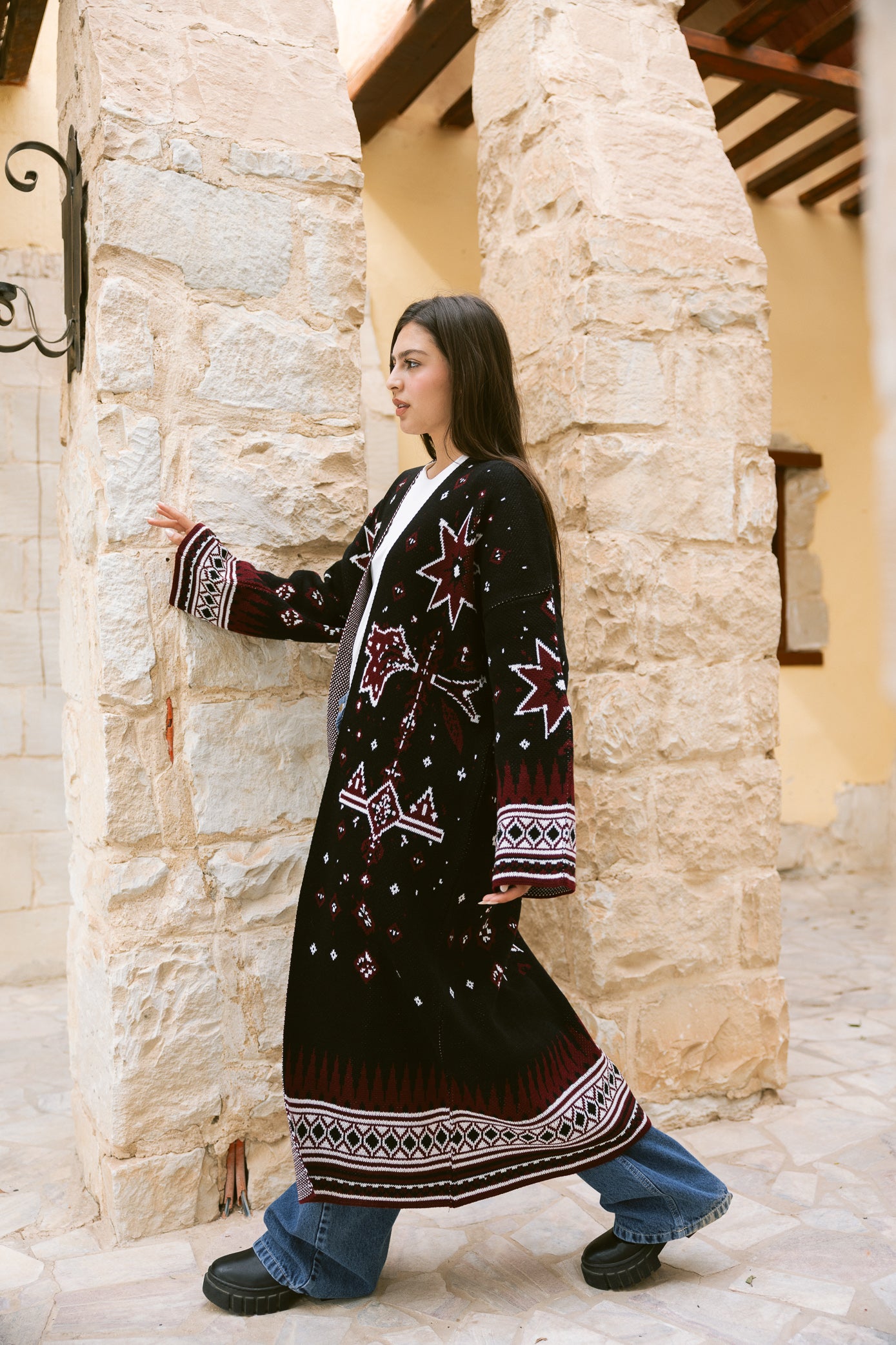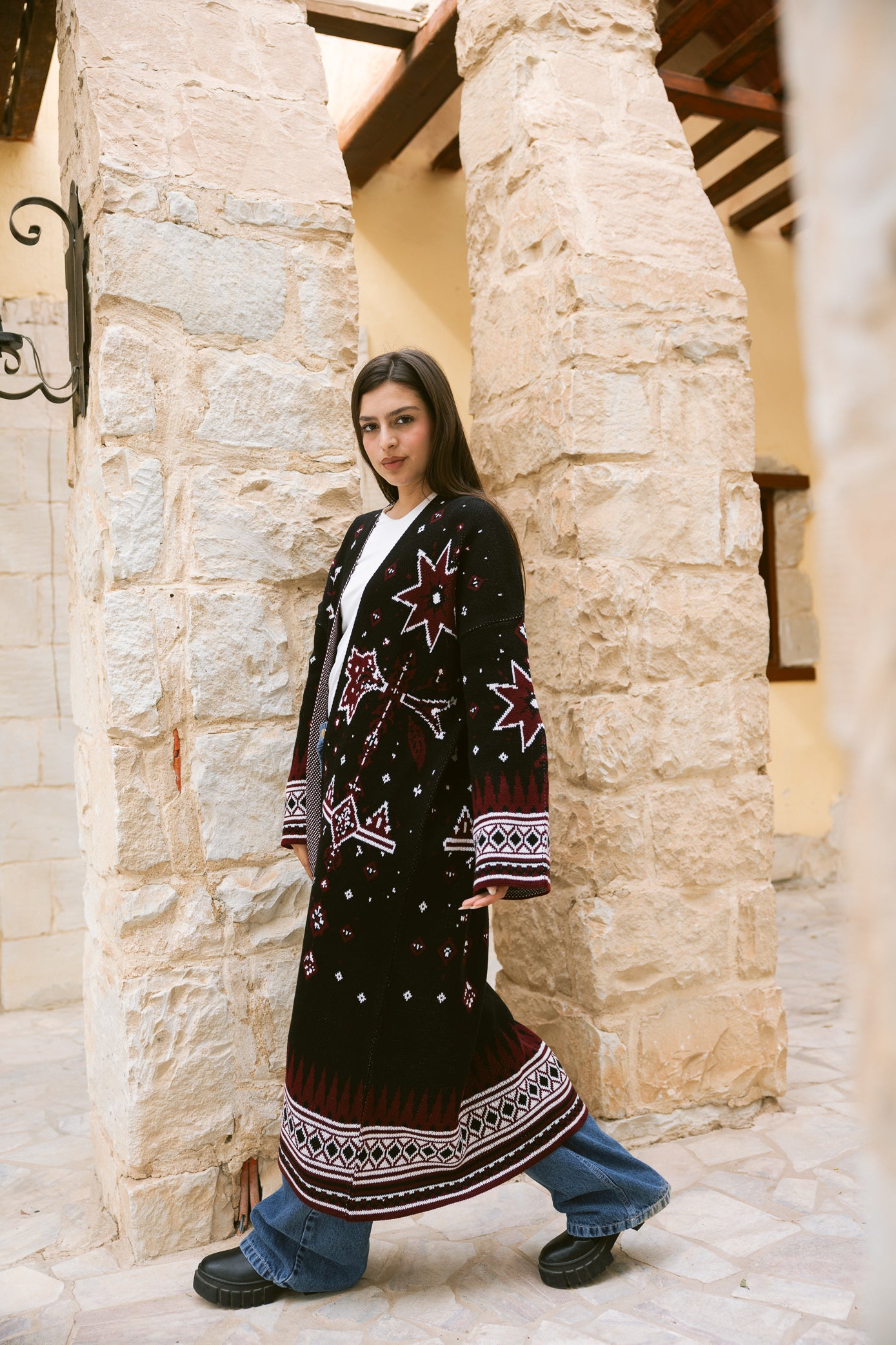 Inspired by the quiet beauty of desert nights, the Nojom Kaftan blends heritage patterns with a modern silhouette. Designed in a rich knitted fabric with statement star motifs, it brings warmth, structure, and effortless elegance to your everyday layering.