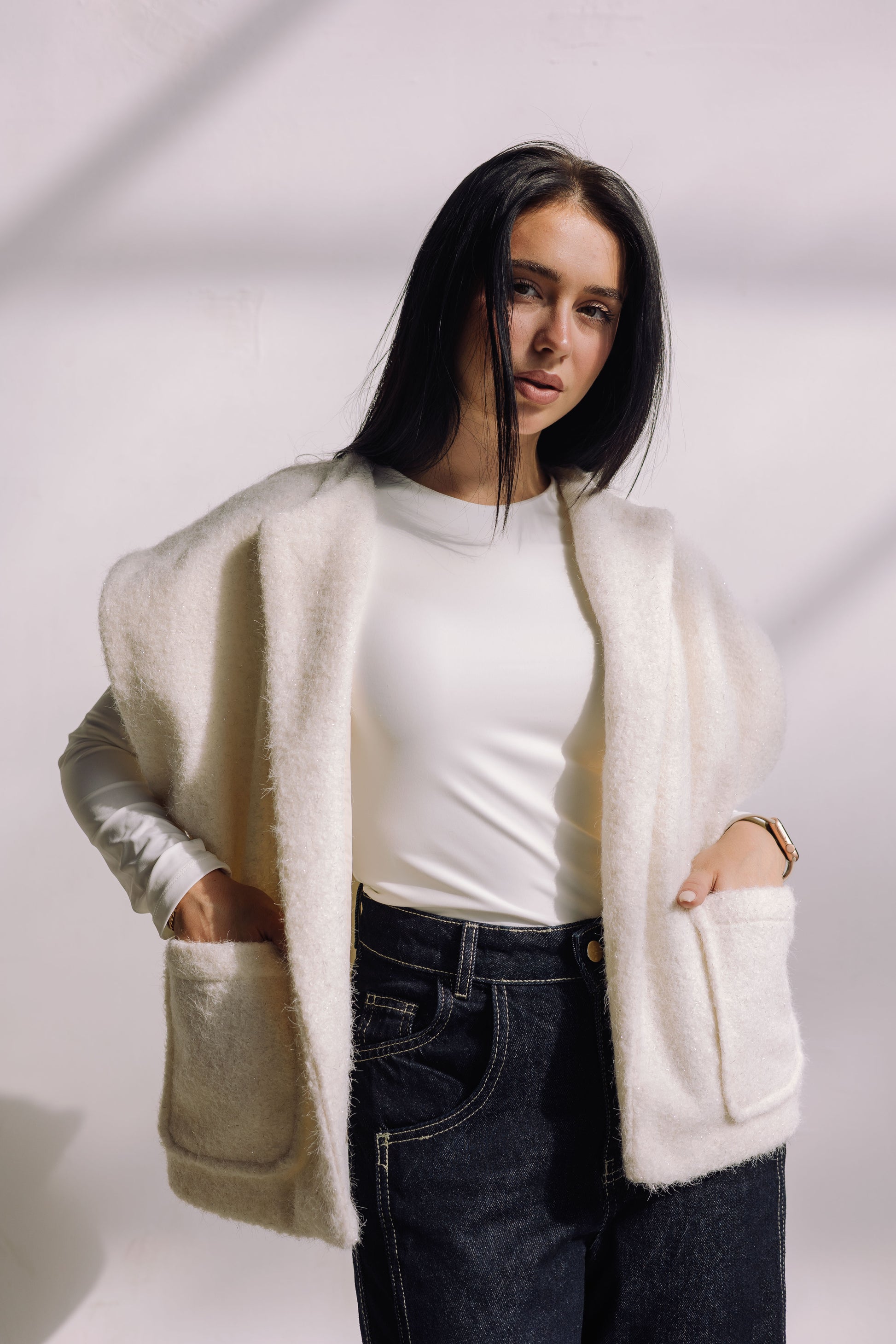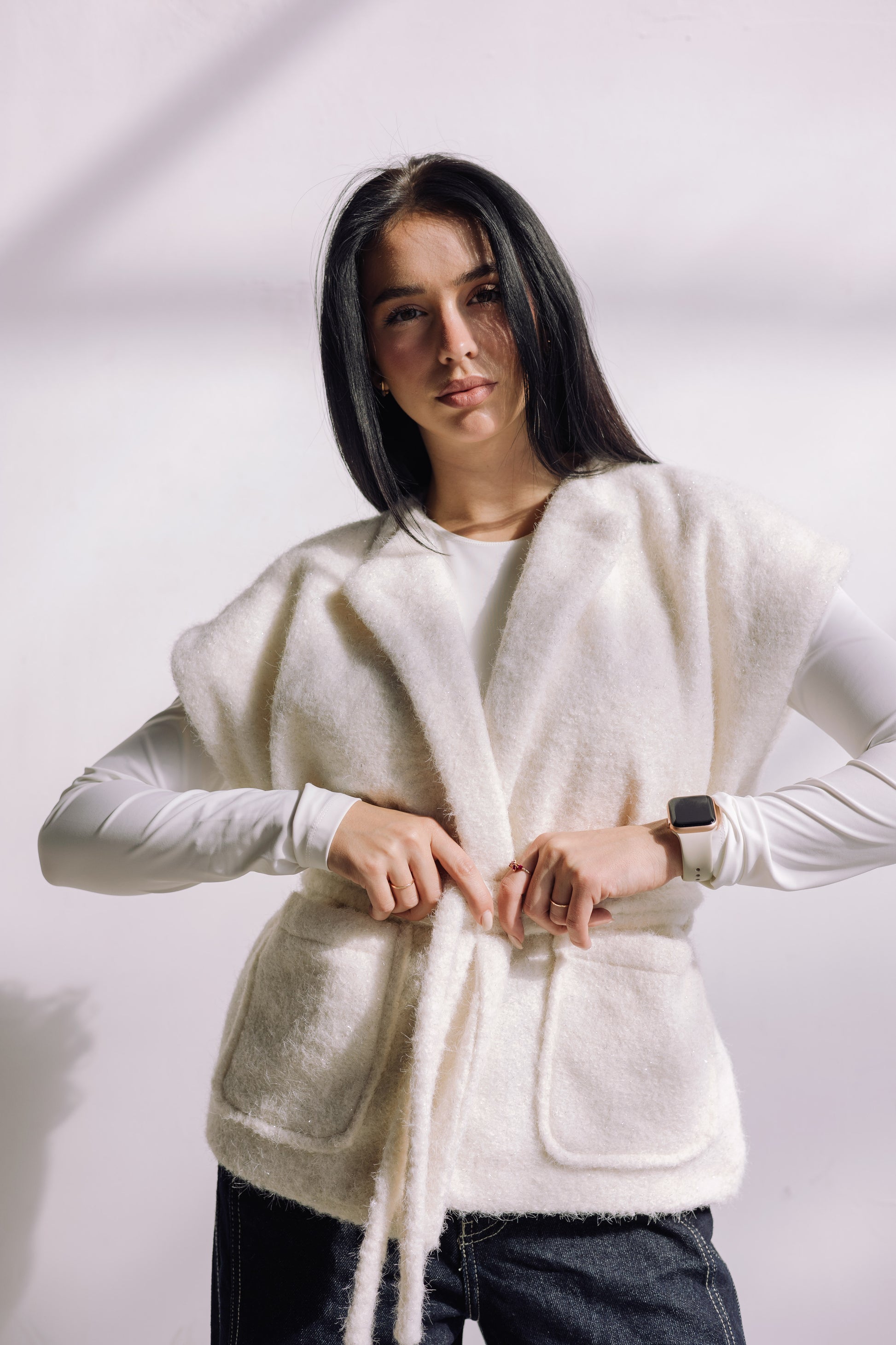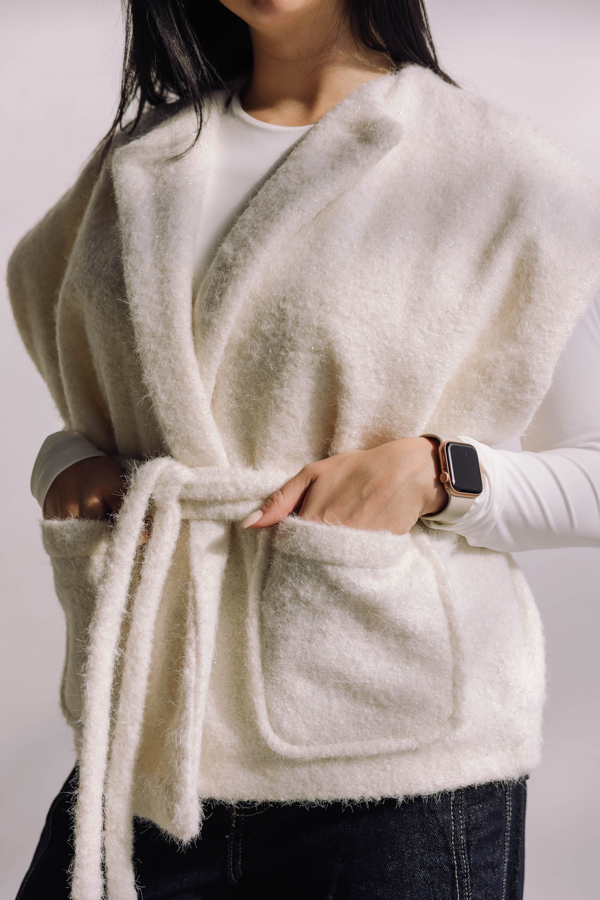 A premium wool-blend vest with a soft textured feel and a built-in subtle shimmer woven directly into the fabric. Designed for warmth, comfort, and versatile styling — wear it open or cinched with the wrap belt.