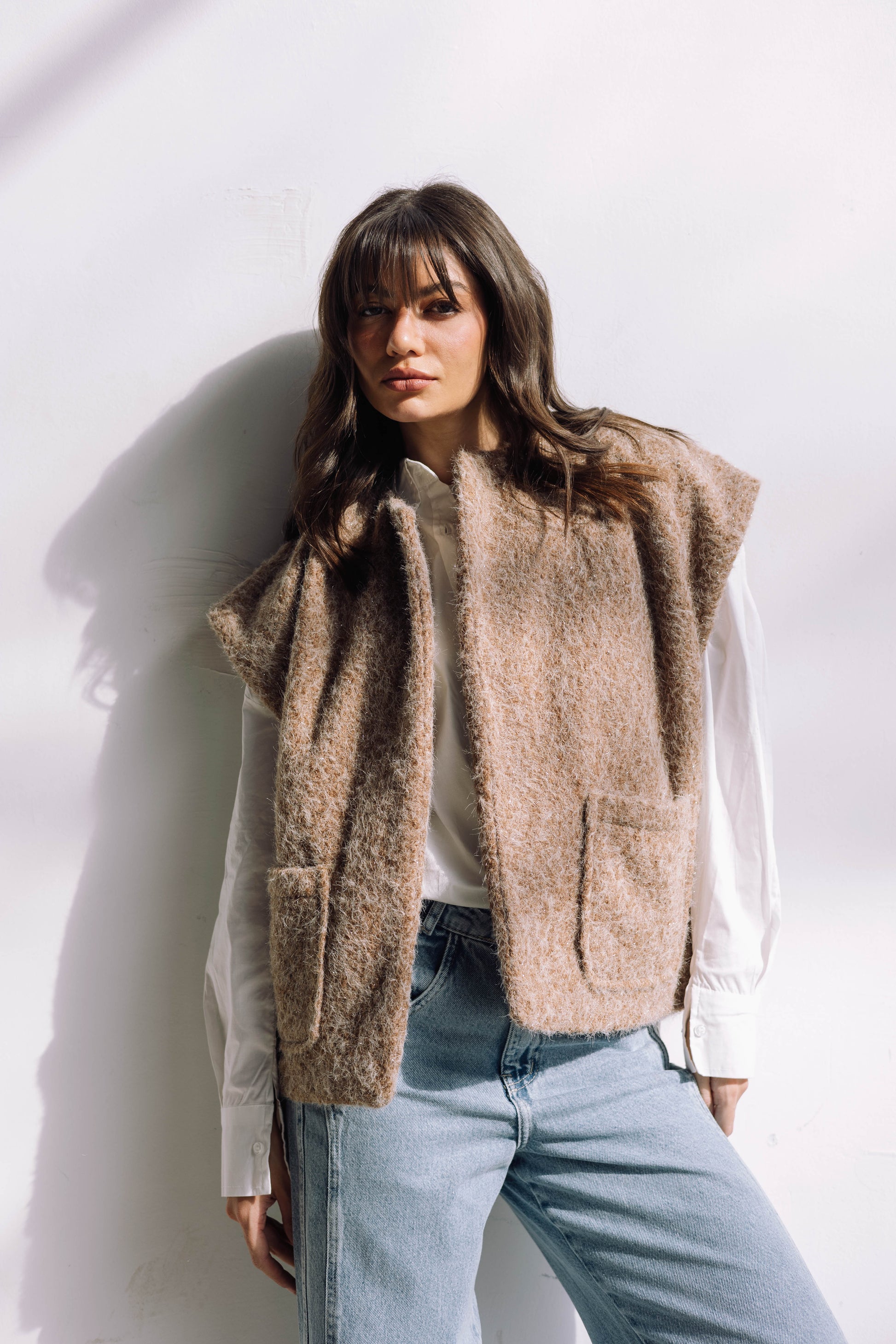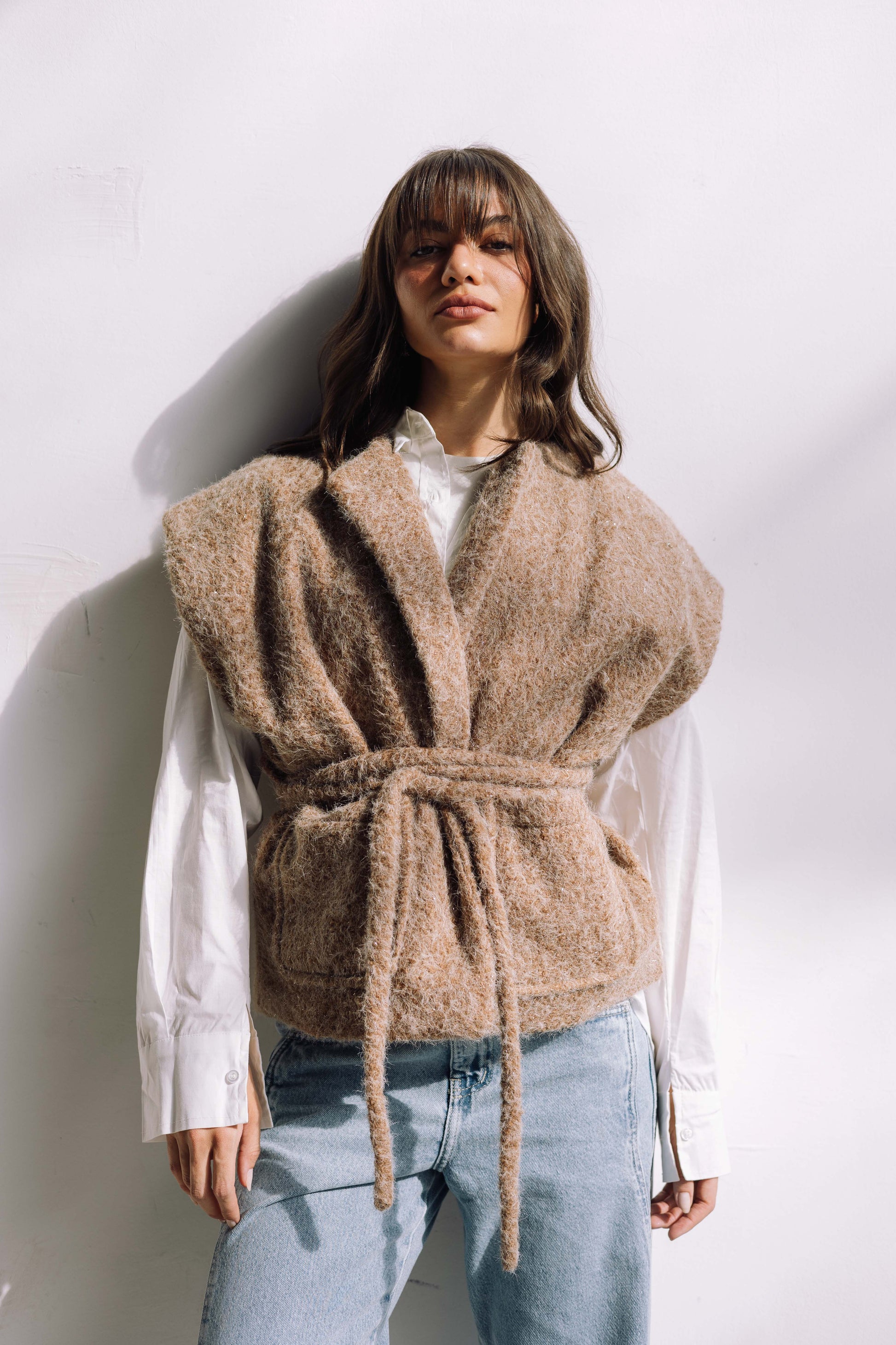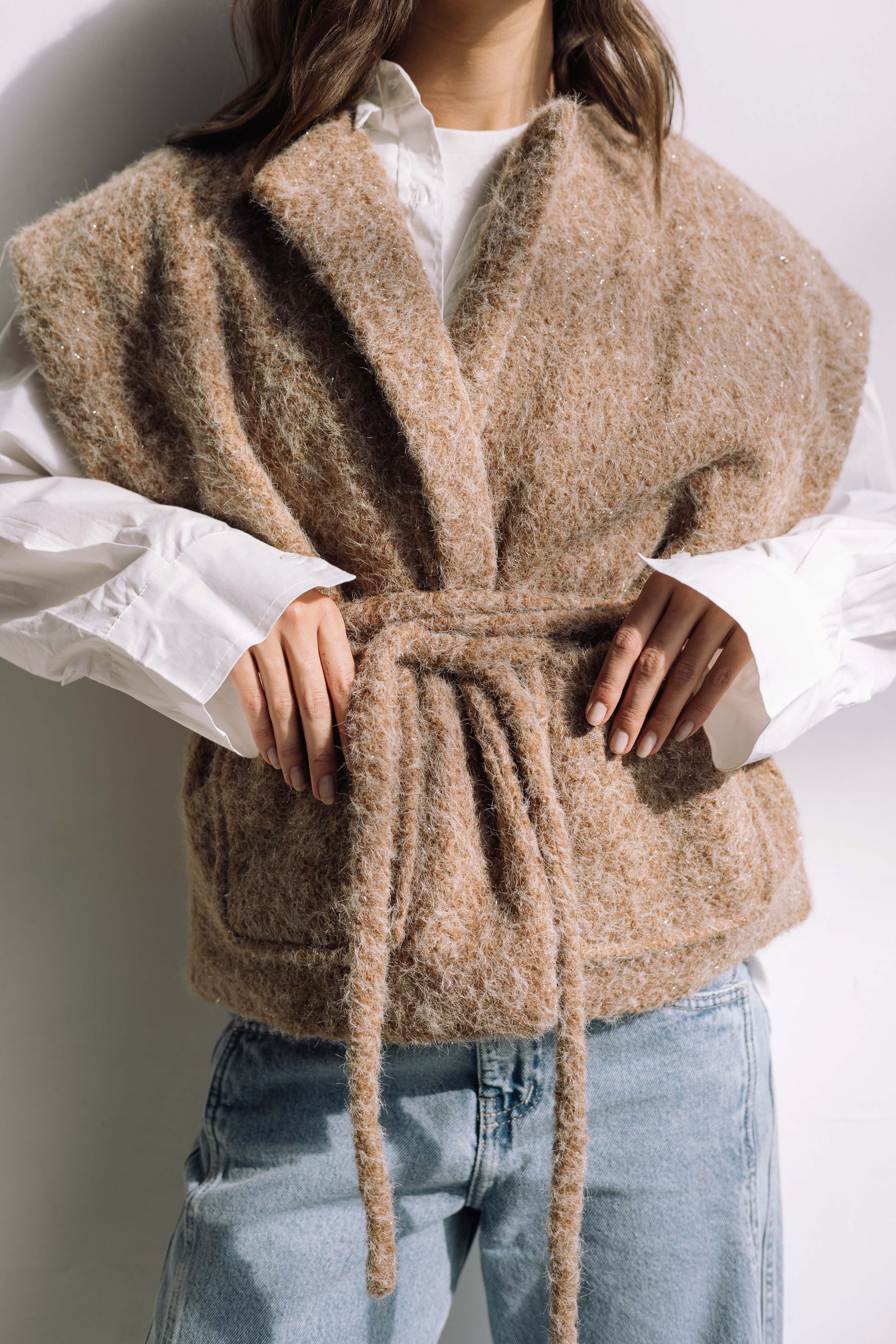 A premium wool-blend vest with a soft textured feel and a built-in subtle shimmer woven directly into the fabric. Designed for warmth, comfort, and versatile styling — wear it open or cinched with the wrap belt.