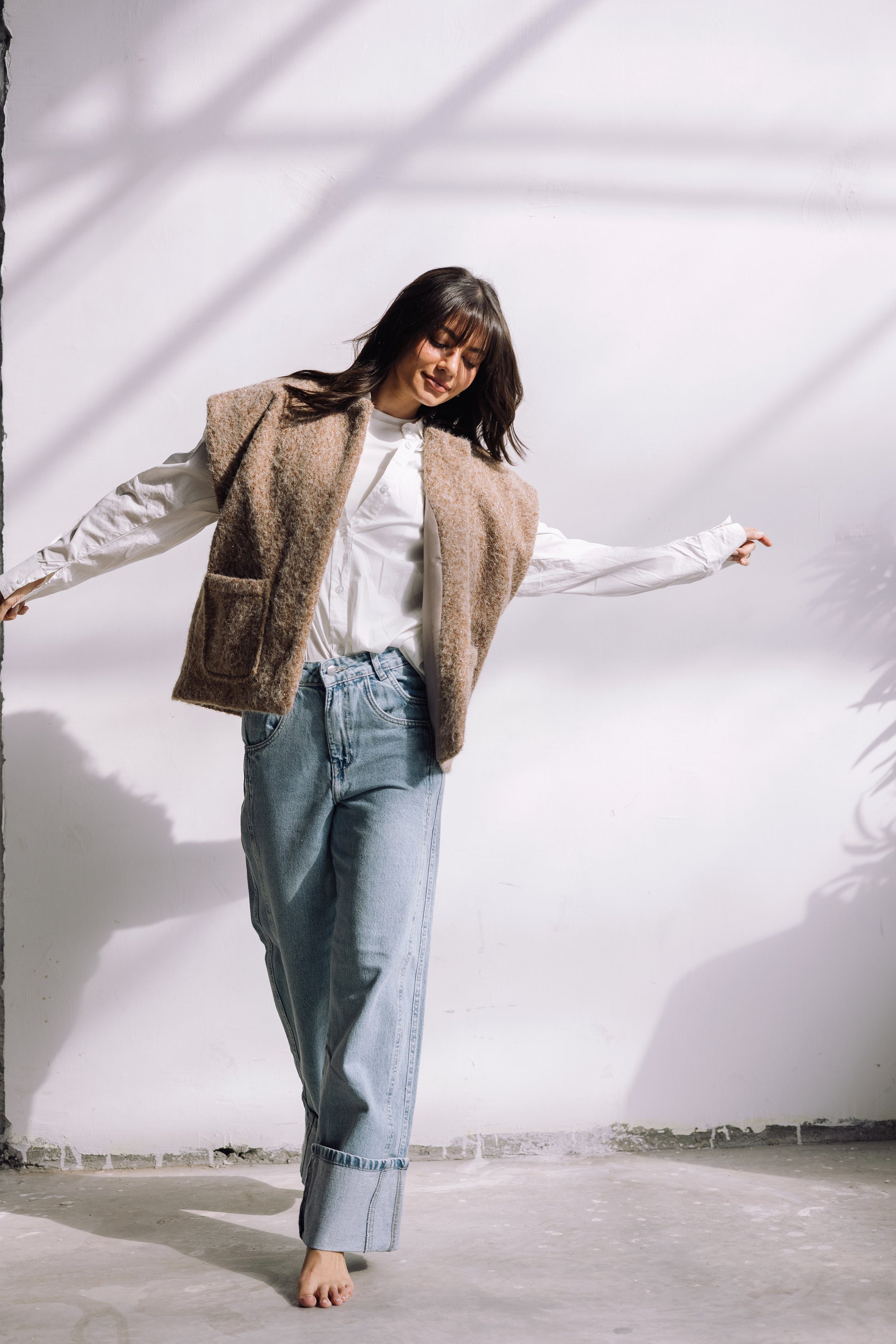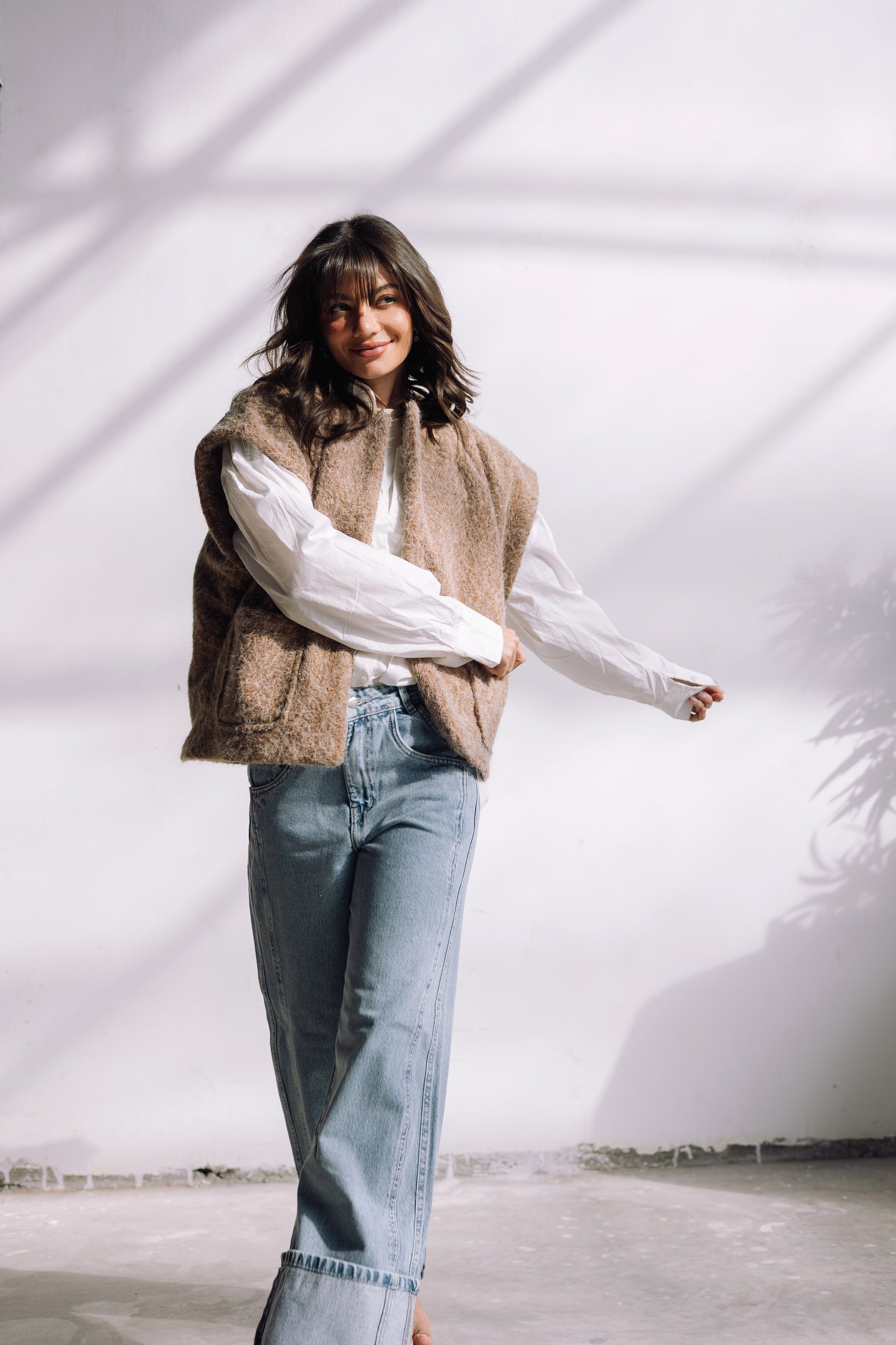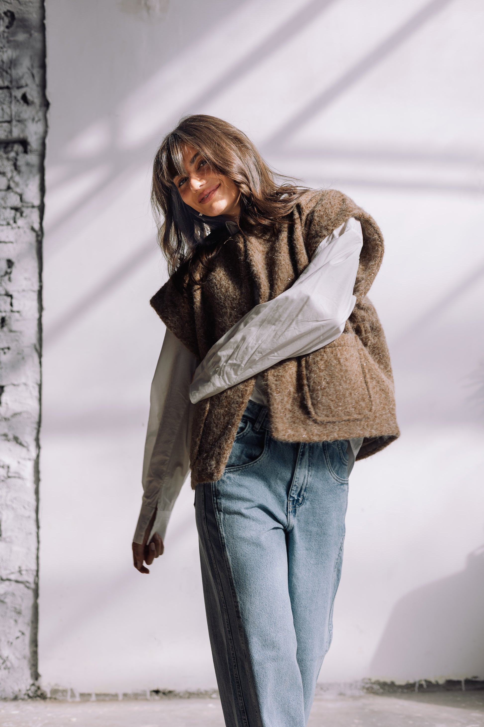 A premium wool-blend vest with a soft textured feel and a built-in subtle shimmer woven directly into the fabric. Designed for warmth, comfort, and versatile styling — wear it open or cinched with the wrap belt.