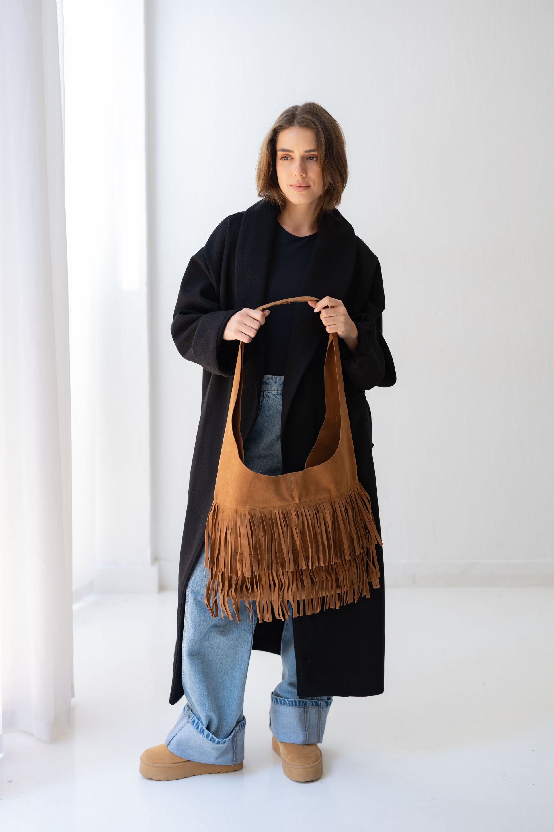 • Style: Slouchy hobo with layered fringe detailing