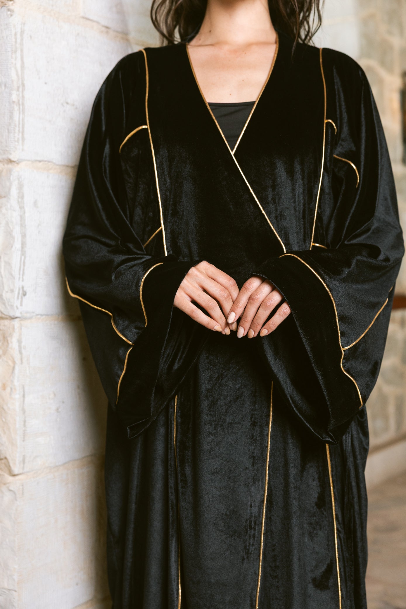 The Winter Whisper Kaftan is made from rich winter suede fabric with a silky velvet-like finish. Designed in a wrap-style cut with subtle piping details that add a refined contrast.