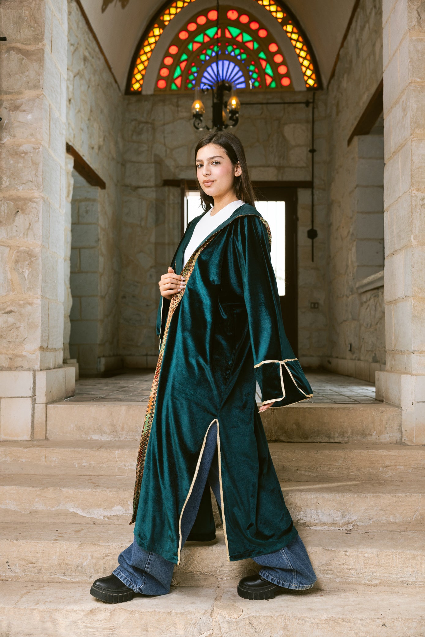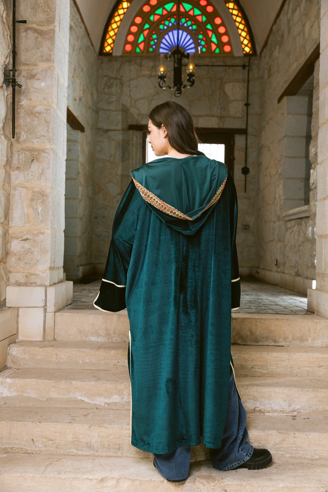 The Zahra Kaftan is crafted from a luxurious velvet fabric with a rich, glossy finish that catches the light beautifully. Designed for winter Ramadan evenings, the fabric is medium-to-heavy weight, offering warmth while maintaining a fluid, elegant drape.